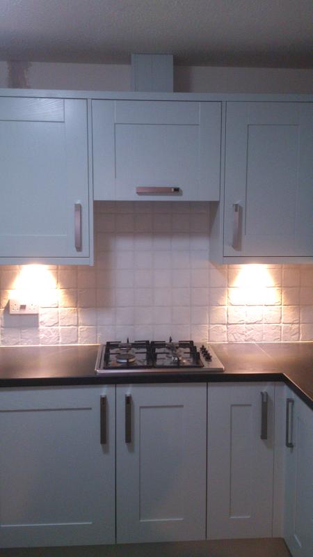Shaker Wood Blue painted kitchen fitted with laminate worktops